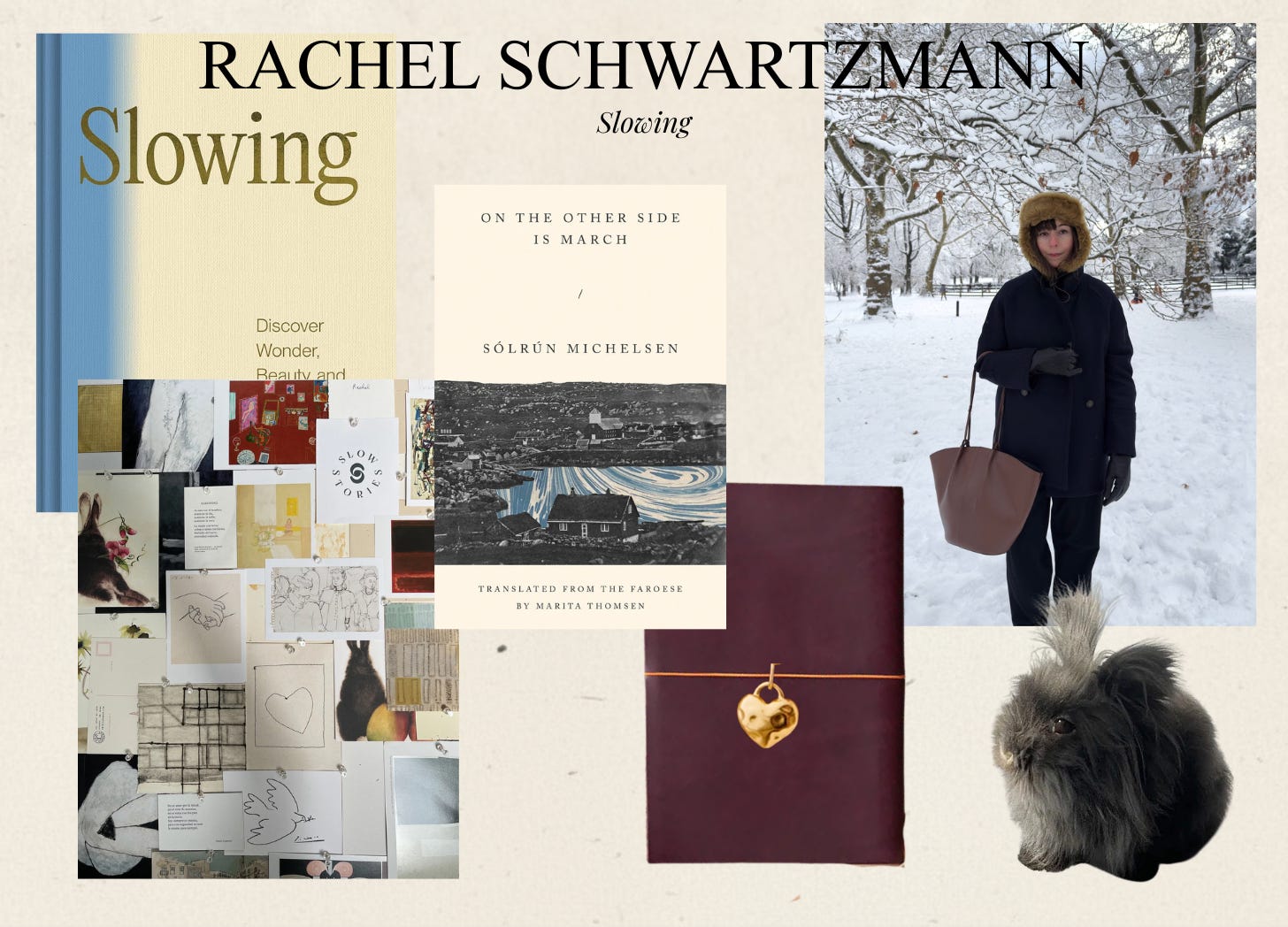 Rachel Schwartzmann is a writer, author, and creator based in Brooklyn, NY. Her first book Slowing (linked below) debuted in September 2024. Rachel writes Slow Stories a newsletter about time, creativity, and pace.